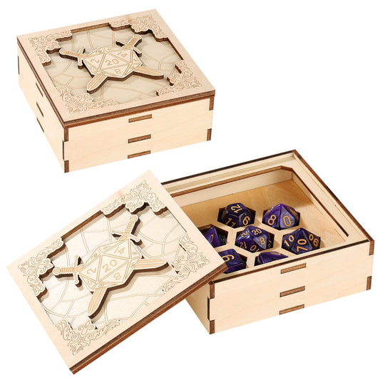 Adventurer's Dice Case – Square Wooden Case with Dual Sword Shield Design for DnD